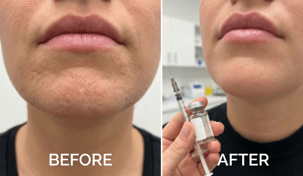 Botulinum toxin is precisely injected into the mentalis muscle, which controls the movement of the chin. By relaxing this muscle, the overlying skin becomes smoother and the dimpling effect is significantly reduced.